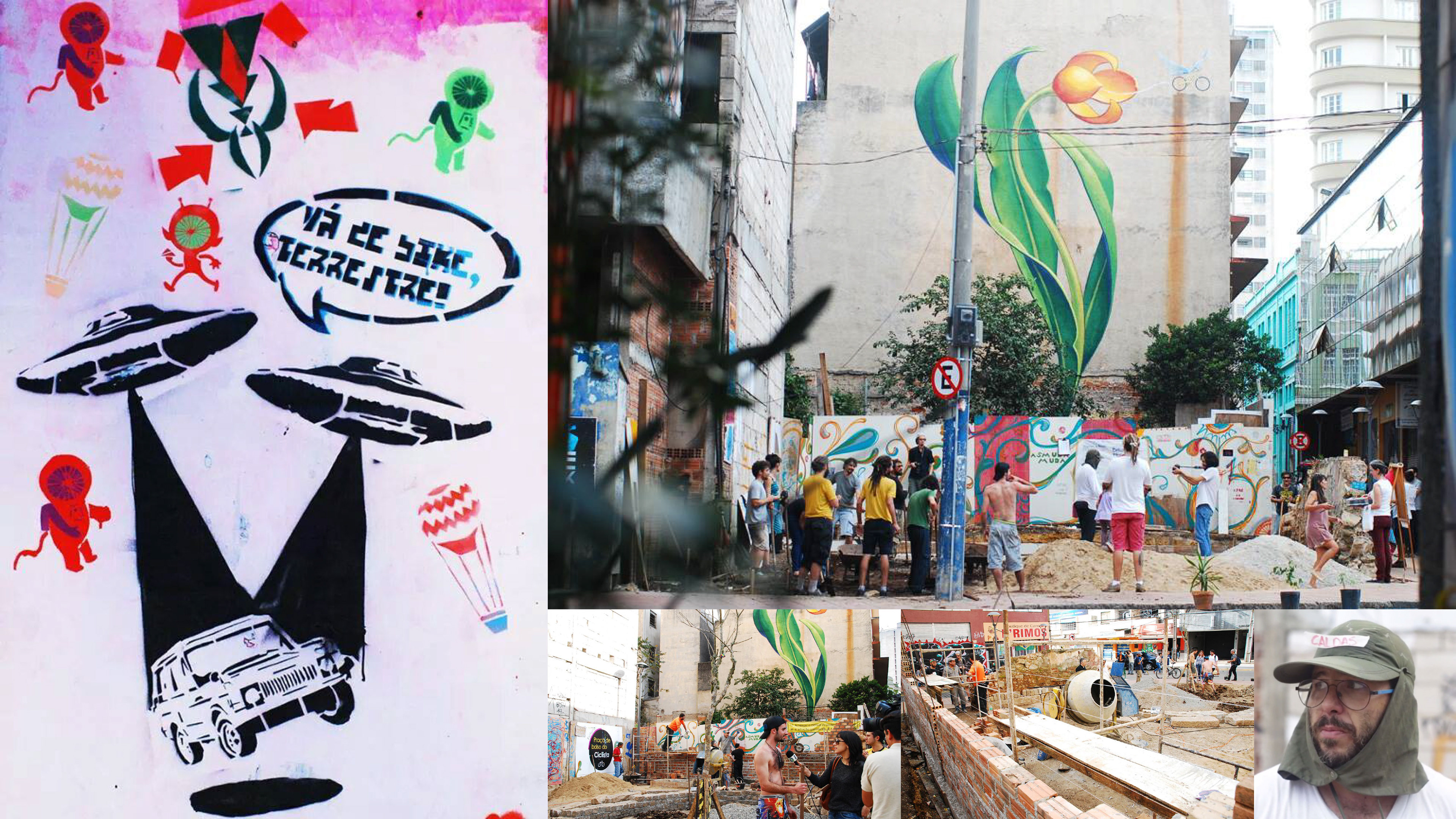 In the graffiti on the left, ETs say "Go by bike, earthling!"; other pictures show several stages of the square. Pictures by Matheus Allegretti Mendes (left), Doug Oliveira (center) and Yasmin Reck (bottom right corner)